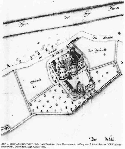 {{sys:text:block|top={{sys:text|size=20|text=Gescheidenis}}<br><br>'''1304''' "Haus Frohnenbruch" wordt als "Burg Vronenbroeck" aan Johann von Stralen in leen gegeven door graaf {{#tag:easyview|{{sys:w:nl}}Reinoud_I_van_Gelre|thumbnail=Reinoud van Gelre|type=iframe}}. De graaf leent de burcht aan de ridder in ruil voor gewapende ruiters.<br>'''1422''' stichting van de kapel in {{#tag:easyview|:Categorie:Ho(e)rstgen (Horstjen)|thumbnail=Hoerstgen|type=iframe}} door de eigenaar van Haus Frohnenbruch, Rytger von Vlodorp en zijn vrouw {{#tag:easyview|{{sys:w:nl}}Wachtendonk|thumbnail=Elsbe von Wachtendonk|type=iframe}}. Voor de bouw van de kapel ging de familie naar {{#tag:easyview|{{sys:w:nl}}Moers|thumbnail=Repelen(Moers)|type=iframe}}.<br>'''1533''' {{#tag:easyview|{{sys:w:de}}Burg Drachenfels (Siebengebirge)|thumbnail=Agnes von Drachenfels|type=iframe}} trouwt met Dietrich von Milendonk. Hierdoor kwam gedurende 200 jaar de burcht in bezit van de familie Milendonk. Daarvoor was de burcht door overerving in bezit van {{#tag:easyview|{{sys:w:de}}Burg Drachenfels (Siebengebirge)|thumbnail=burgraven von Drachenfels|type=iframe}}.<br>'''1626''' Start van de bouw van de "Fossa Eugeniana". Kanaal wat de Rijn en de Maas moet verbinden. Dit om de handel met Holland te blokkeren. Op de kaart van 1698 staat de "Fossa Eugeniana" als Nieuwe Rijn aangeduid.<ref name="ref">Informatie afkomstig van {{#tag:easyview|http://www.frohnenbruch.de/html/geschichte.html|thumbnail=700 Jahre Haus Frohnenbruch|type=iframe}}</ref> | |||